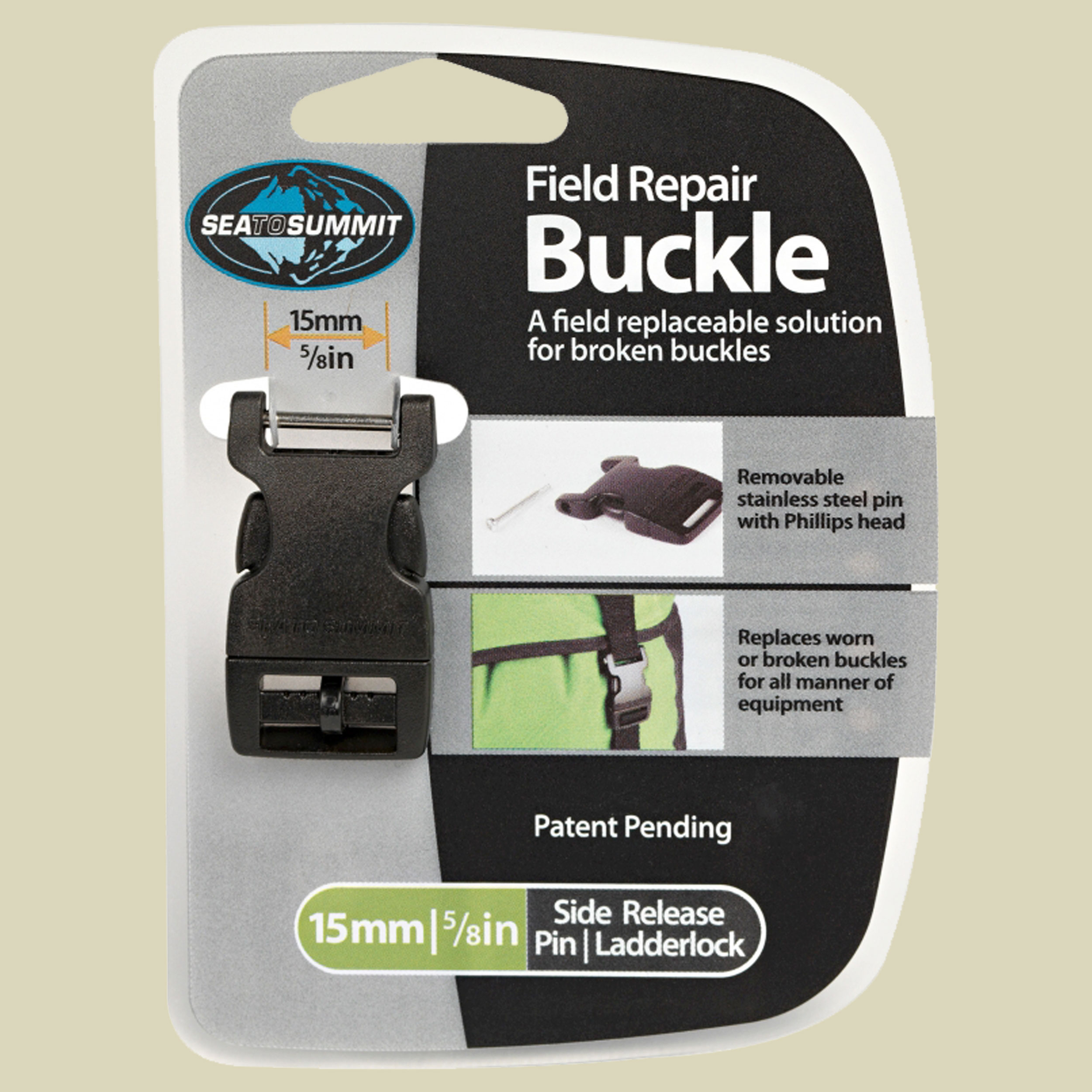 Leichte, stabile Ersatzschnalle von Sea To Summit für alle Arten von Dry Sacks und Rucksäcken. Die Field Repair Buckle Side Release 15 mm von Sea To Summit ist der ideale Ersatz für jede Schnalle und passt auf unzählige Taschen- und Rucksäcke. Der absolut reibungslose Austausch geschieht durch Herausdrehen des Edelstahlstäbchens und Einsatz der Kunststoffschnalle.