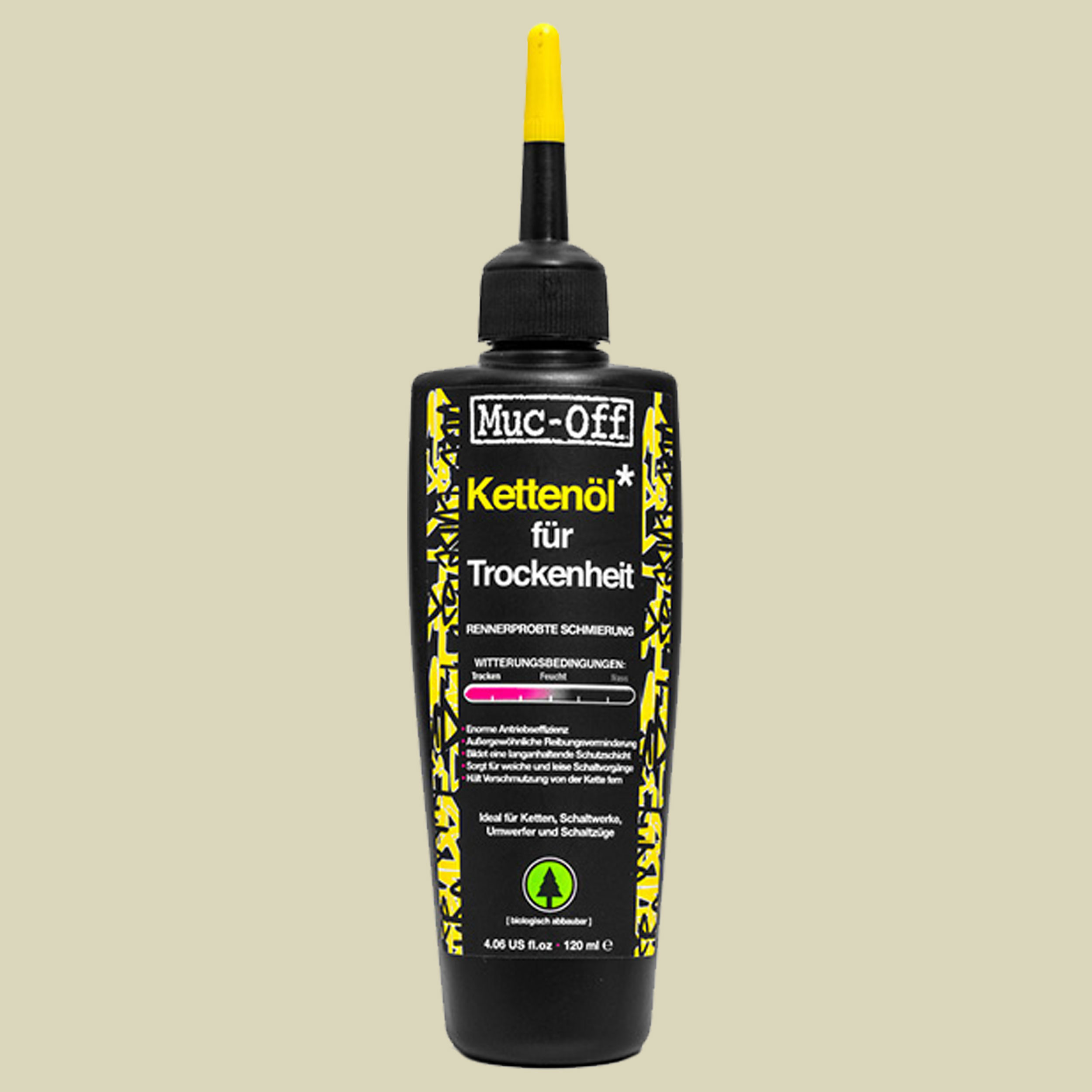 Das Kettenöl für Trockenheit von Muc Off schmiert die Fahrradkette und ist umweltverträglich. Das Schmiermittel vermindert die Reibung, sorgt für weiche Schaltgänge und hält Verschmutzungen fern durch die langanhaltende Schutzschicht. Das Öl ist einfach anzuwenden: Vor dem ersten Gebrauch die Kette von Fettresten befreien und trocknen. Behälter kräftig schütteln und Schmiermittel auftragen, so dass alle Teile der Kette mit dem Schmieröl in Kontakt kommen. Idealerweise 3-4 Stunden vor dem Fahrradfahren anwenden. Überschuss mit einem Tuch abwischen. Kontakt mit Bremsen vermeiden.