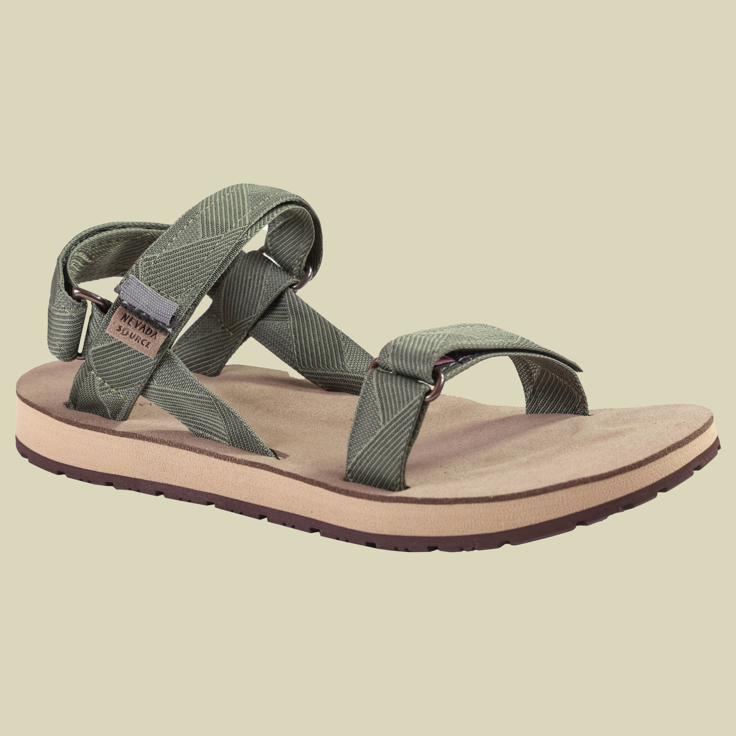 Die Sandale Nevada Men mit Messingschnallen ist eine elegantere Version der bewährten Source Trekkingsandalen, die sich für alle Outdoor-Aktivitäten eignet. Die dreifach gepolsterten Riemen mit dem patentierten X-Strap-System lassen sich mit Klettverschlüssen über dem Vorderfuß, dem Spann und an der Ferse einfach verstellen und jeder Fußform optimal anpassen. Das verwendete Material der veganen Mikrofaser Innensohle sorgt für ein sehr angenehmes Fußklima und hält die Füße trocken und kühl. Die Kombination der Gummi Außensohle mit einer geformten EVA-Zwischensohle der Herren-Trekkingsandale Nevada garantiert höchsten Tragekomfort. Die Außensohle besteht aus abriebfestem synthetischem Gummi für hohen Grip und Langlebigkeit. Verbindet man den Fersenriemen mit dem Vorderriemen lässt sich die Sandale in einen Slipper verwandeln.