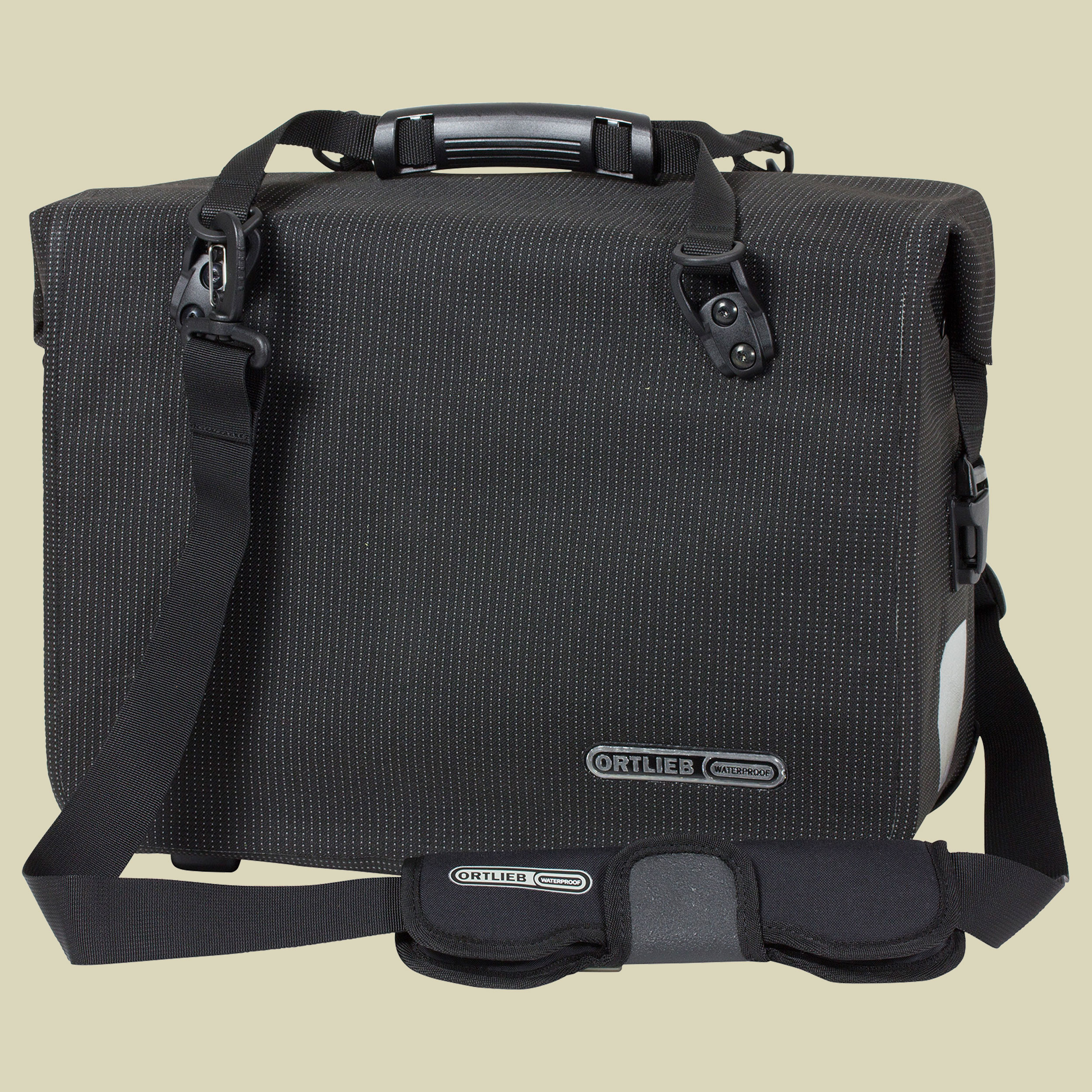Mit der Office-Bag High Visibility von Ortlieb bringt man seine Utensilien sauber und trocken per Fahrrad ins Büro. Die wasserdichte Fahrradaktentasche bietet Stauraum für zwei DIN A4 Ordner, Schreibzeug, Handy und Co. Das wasserdichte PU-beschichtete Cordura-Gewebe in schwarz ist komplett mit einem leuchtstarken Reflexgarn durchzogen. Außerdem sorgen leuchtstarke Reflektoren für bessere Sichtbarkeit im Dunkeln. Im Büro angekommen lässt sich die Office-Bag mit einem Handgriff abnehmen und dank dem gepolsterten Schultergurt bequem tragen. Die Office-Bag High Visibility wird einzeln geliefert und ist mit dem Quick-Lock2.1 System ausgerüstet.