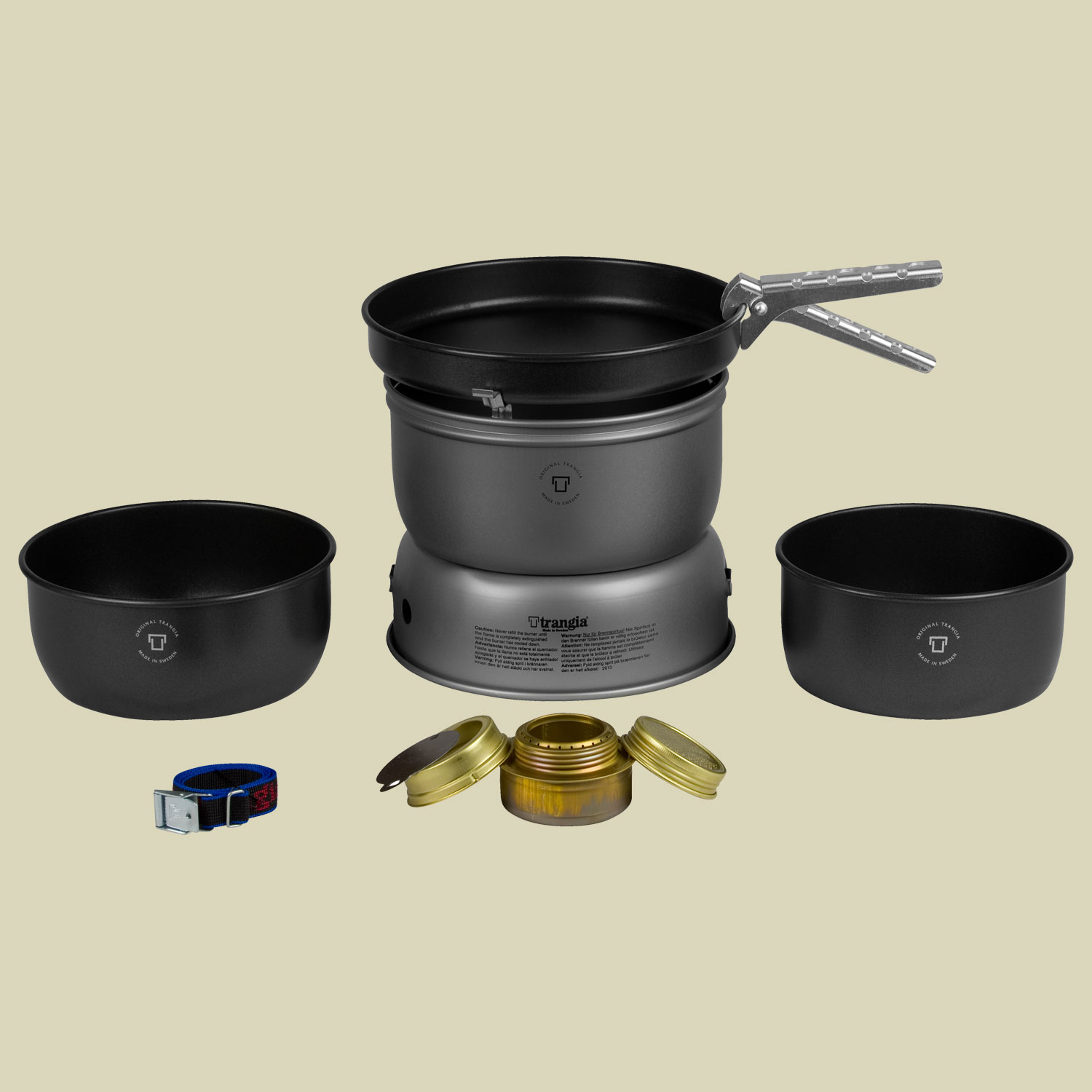Der Spiritus Sturmkocher groß von Trangia wird mit Non-Stick antihaftbeschichteten Töpfen und Pfanne geliefert. Einfach Spiritus in den Tank geben, anzünden und los gehts. Mit Hilfe des verschiebbaren Deckels ist die Flamme des Trangia Sturmkochers schnell und einfach zu regulieren. Non-Stick ist eine Beschichtung, die sich besonders gut zum Braten mit wenig oder ohne Fett eignet. Dabei brennt beim Spiritus Kocher von Trangia nichts an und die Reinigung ist wesentlich leichter. Non-Stick ist etwas empfindlicher gegen Kratzer und Verschleiß. Deshalb empfiehlt es sich, nur Kunststoff- oder Holzbesteck zu verwenden.