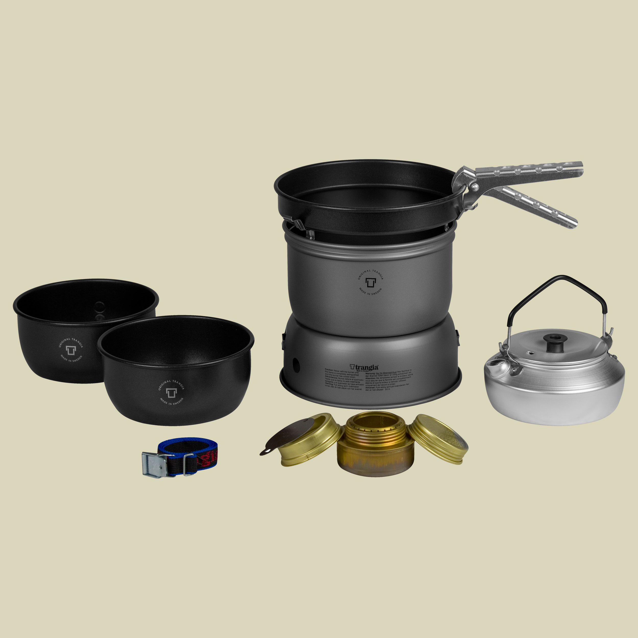 Der Trangia Sturmkocher klein 27-6 HA ist aus ultraleichtem Aluminium, hart eloxiert. Das Kocherset eignet sich optimal für Solowanderer oder 2 Personen. Durch sein kleines Packmaß braucht es im Rucksack nur wenig Platz. Alle Kocher der Serie 27 enthalten zwei antihaft-beschichtete 1-Liter-Töpfe, einen mit Maßeinteilung und einen ohne, eine 18 cm-Bratpfanne mit extra Antihaft-Beschichtung, Windschutz (oben und unten), Brenner, Zange sowie Riemen. Zusätzlich enthält dieses Set noch einen Wasserkessel mit einem Fassungsvermögen von 0,6 Litern. Hergestellt ist das Trangia-Set aus einer hartanodisierten Aluminiumlegierung, einem Material, das bis zu 50 % stärker als herkömmliches Aluminium und äußerst abriebfest ist. Hierdurch wird das Trangia Sturmkocher-Set leichter und abriebfester, es hält länger und ist leichter zu reinigen.