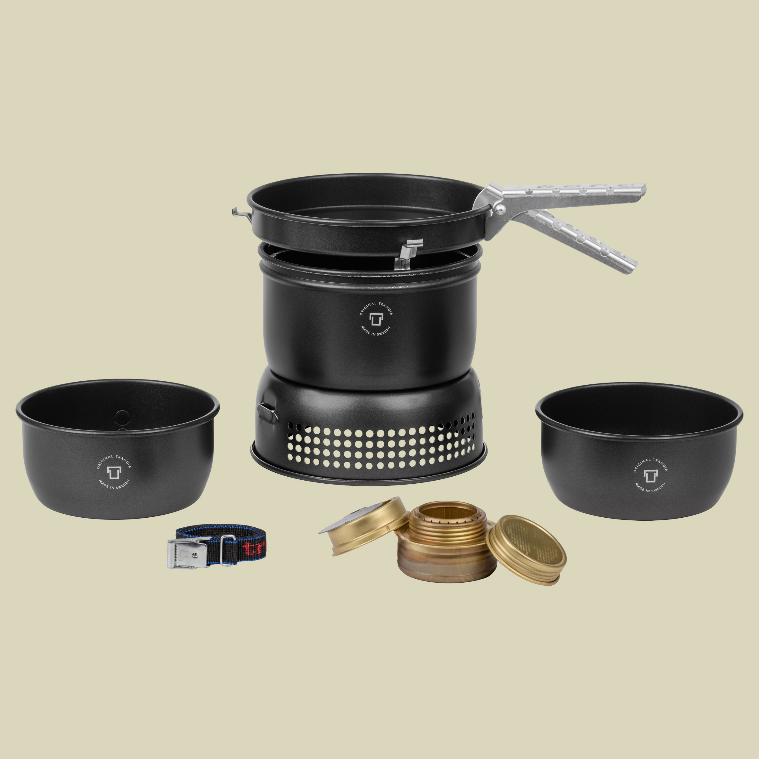 Ein Campingkocher im Set mit Camping Geschirr – der Trangia Sturmkocher klein Ultra Light Black Edition: Der legendäre Spiritus Trangia Kocher in kompakter Ausführung (kleiner und leichter) zusammen mit Aluminium-Windschutz, Aluminium-Töpfen und Pfanne mit Non-Stick Antihaftbeschichtung. Der Trangia Sturmkocher ist sehr einfach zu handhaben: Spiritus in den Tank des Sturmkocher geben, anzünden und los gehts. Mit Hilfe des verschiebbaren Deckels kann die Flamme des Campingkochers einfach reguliert werden. Die zusätzliche Non-Stick Antihaftbeschichtung erleichtert die Reinigung und ermöglicht fettarmes Kochen und Braten. Da die Beschichtung anfällig für Kratzer ist, ist die Verwendung von Kunststoff- oder Holzbesteck empfehlenswert. Das Set lässt sich platzsparend ineinander verstauen und besteht aus einem Spiritusbrenner mit Windschutz, 2 Töpfen aus und einer Pfanne und einem Griff.