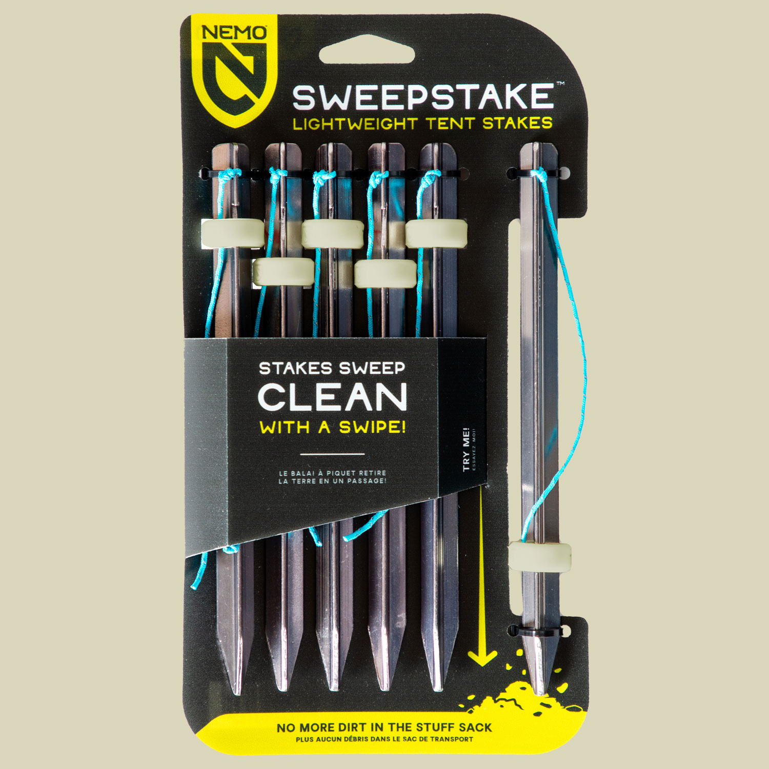Die Nemo Equipment Zeltheringe Sweepstake™ müssen nicht verschmutzt in den Aufbewahrungsbeutel zurück. Mit dem strapazierfähigen, befestigten Polymer-Ring lässt sich Schmutz einfach abstreifen. Der Polymer-Ring an dem Sweepstake™ hat den weiteren Vorteil, dass er bei Dunkelheit leuchtet und der Zelthering nicht zur Stolperfalle wird. Die Nemo Equipment Zeltheringe Sweepstake™ werden im 6-er Pack geliefert.